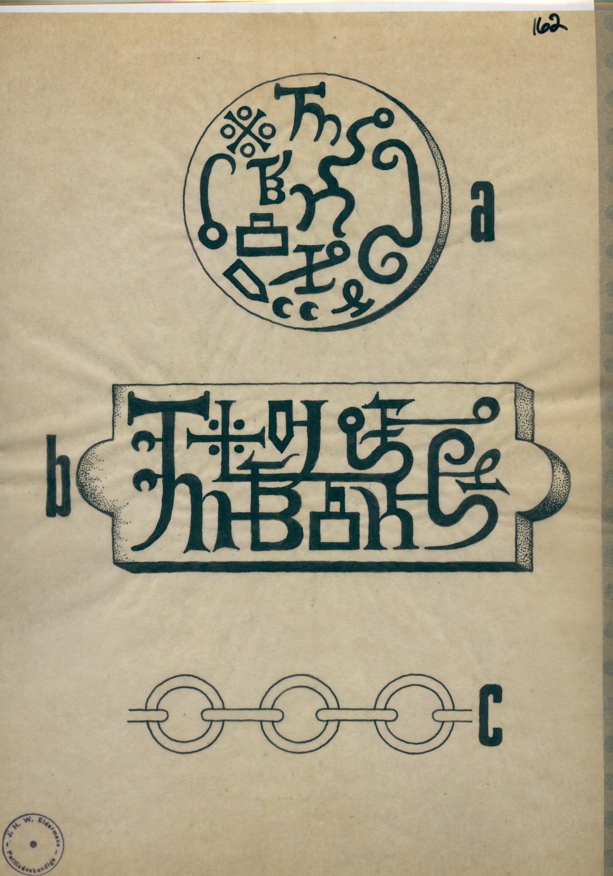 R/1/162 – Drawing of a round and oblong tablet with sigils, and connected rings