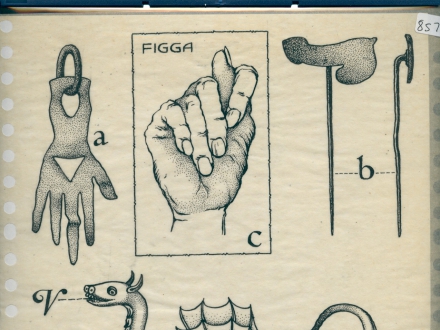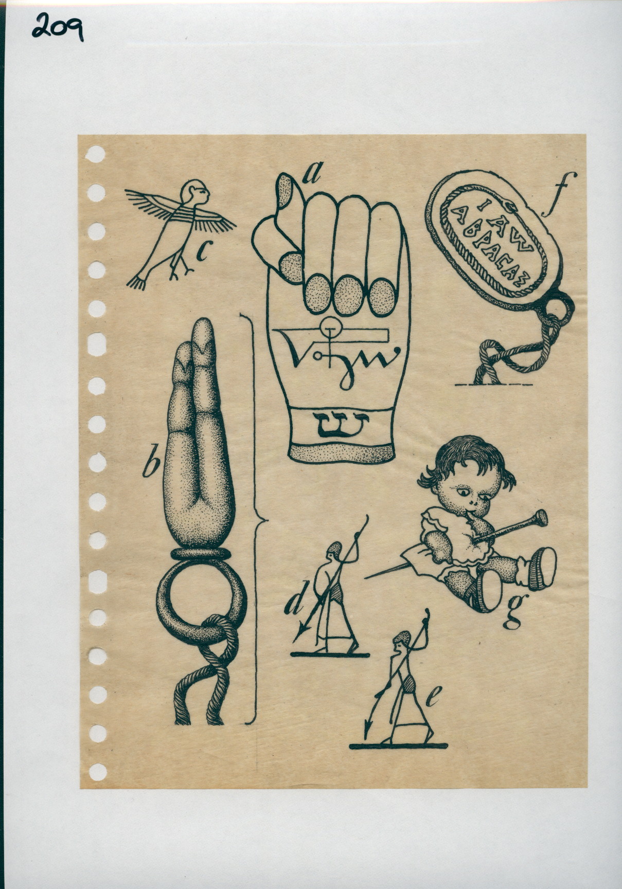 R/1/209 – Drawing of a Egyptian bird, mano figa, amulet, doll and others