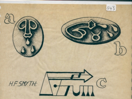 R/1/26 – Drawing of an unfolded cube, an amulet with phallus, a circle and an oblong object