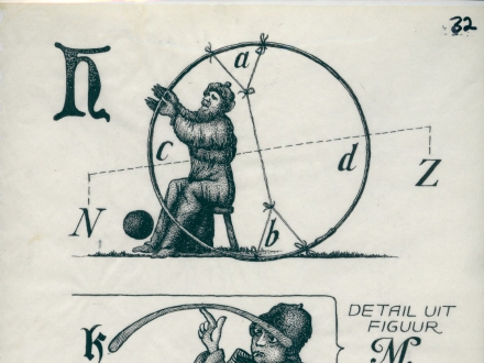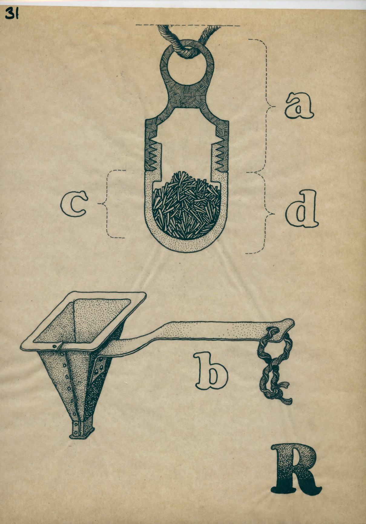 The object hangs on a rope, and is filled with small sticks ??? It is divided in ‘a’ (the upper part), ‘c’ and ‘d’ (the lower part). The funnel ‘b’ has a long handle a looks to be made of metal. ‘R’ in right lower corner.