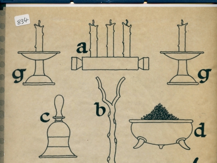 - print of circle and candle, incense burner, crossed bones, scourge, phallic wand; and notes