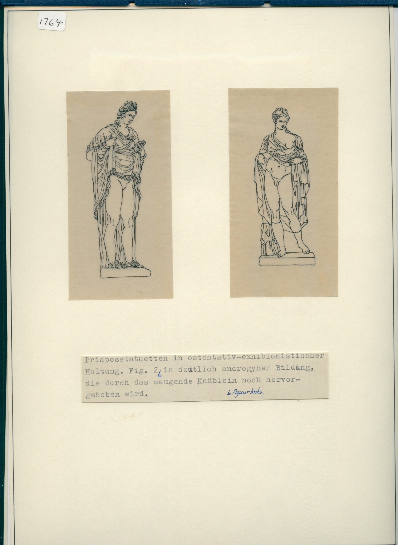 Priaposstautuetten in ostentavi-exhibionistischer Haltung. Fig. 2 in deutlich androgygner Bildung, die durch das saugende Knablein noch hervorgehoben wird. = figuur links.