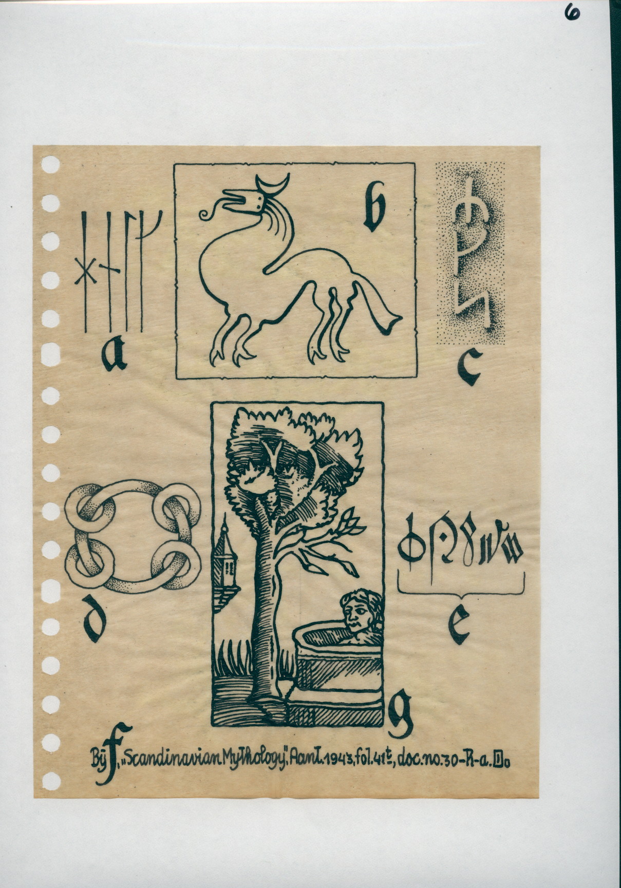 Notes: ‘Bij [by] f, “Scandinavian Mythology”, aant [notes] 1943, fol. 41t, doc. No. 30-R-a. O.’ Runes ‘a’, horse-figure ‘b’, runes again (?) ‘c’, Ring with 4 smaller ones ‘d’, tree and man ‘g’, letters ‘e’.