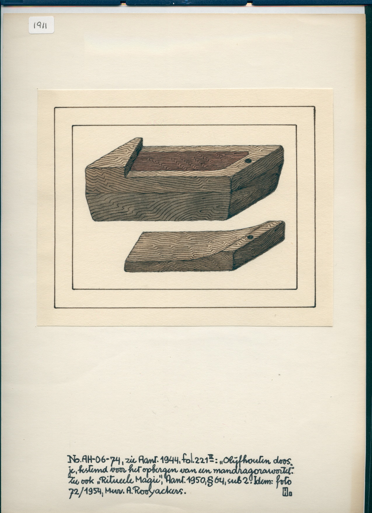 No. AH-06-74, zie Aant. [see notes] 1944, fol. 221II: Olijfhouten doosje, bestemd voor het opbergen van een mandragorawortel [olive wood box, meant for the storing of a mandrake-root]. ZIe ook [see also] Ritueel Magie [ritual magic], Aant. [notes] 1950, § 64, sub 2. Idem: foto 72/1954, Mevr. [mrs.] A. Rooyackers. H.