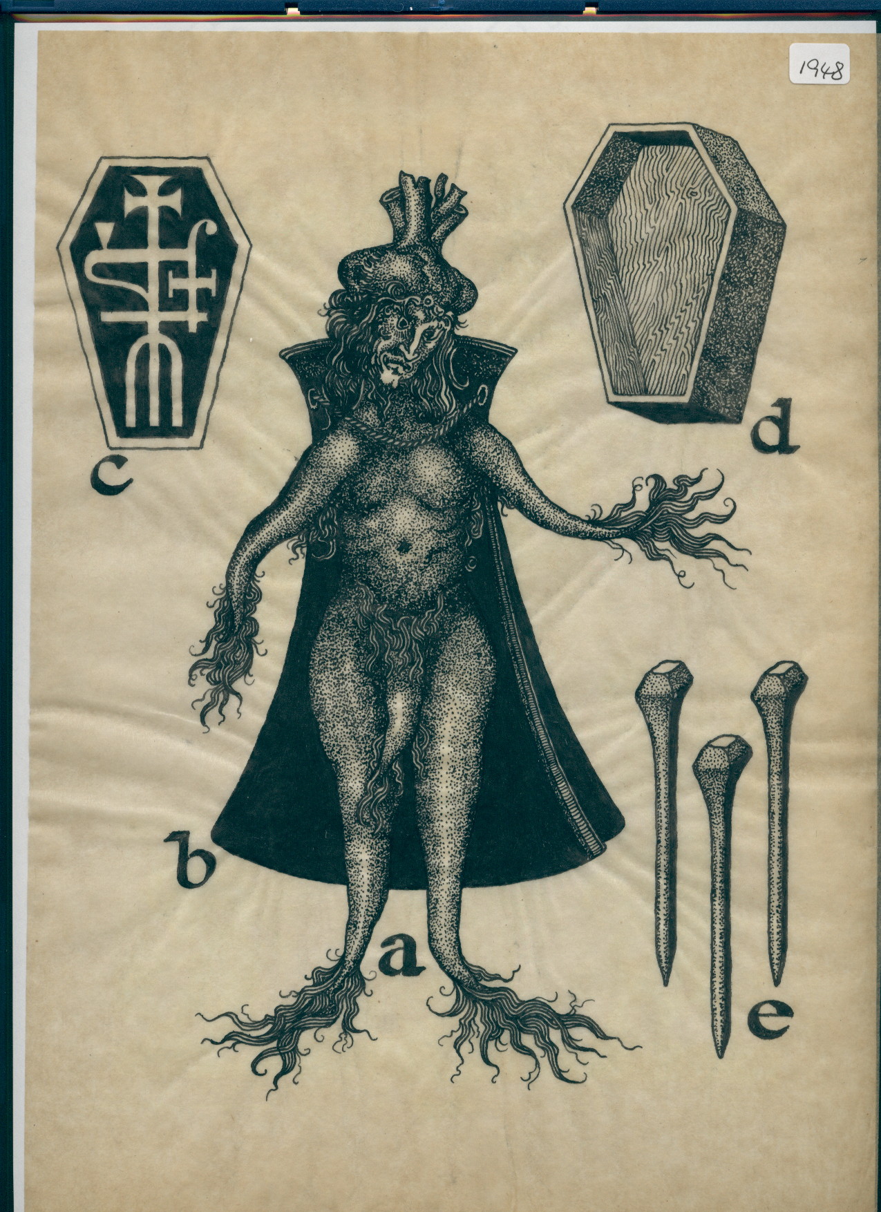 drawing of a mandrake-man, a coffin and nails