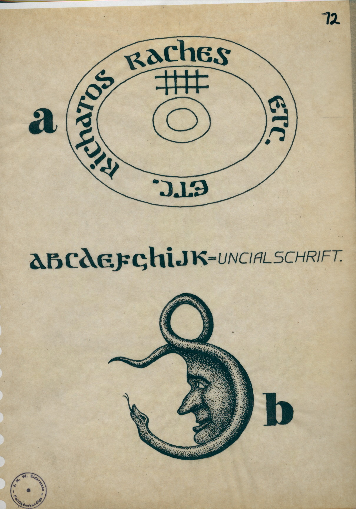 The circle has a double ring and a roster at the center. Around it is written ‘richatos raches etc.etc.’ In the middle of the page is written a to k ‘= uncial schrift [script]’. Bottom of the page a moon face with a snake ‘b’, looks like a pendant.