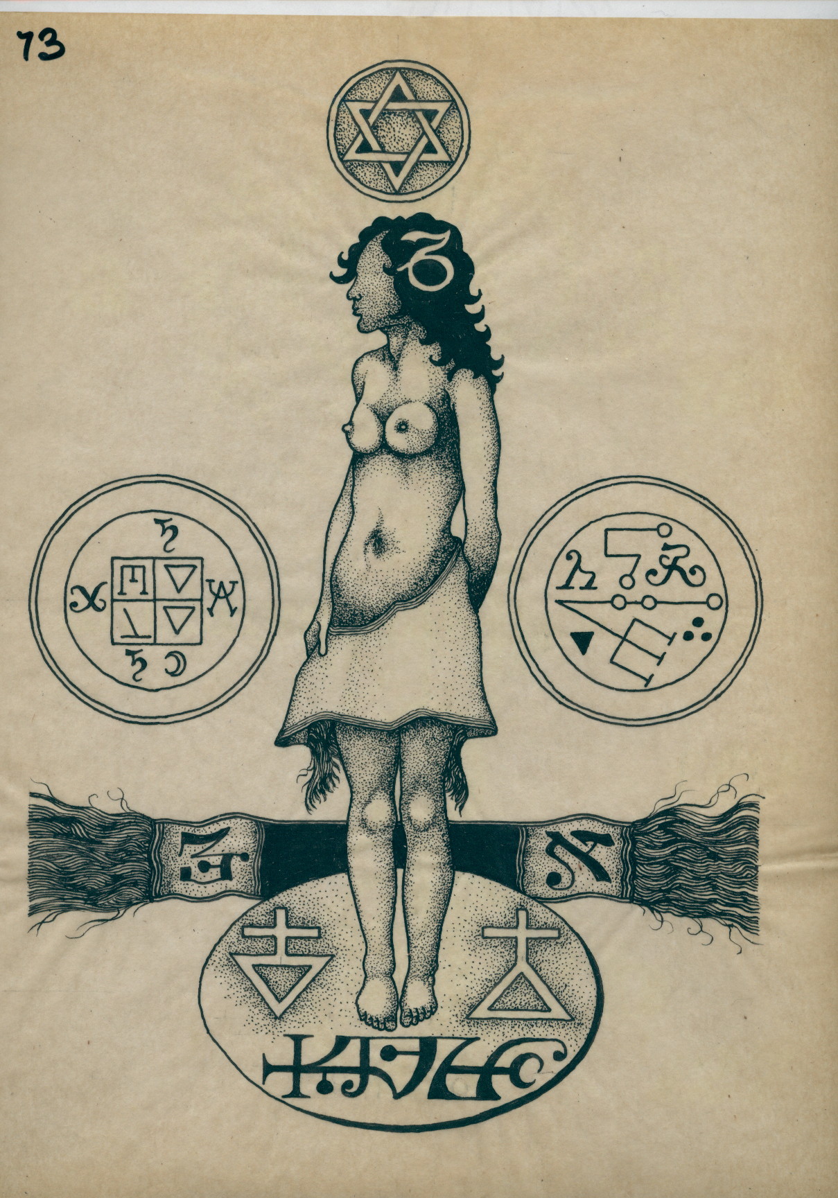 She is bare breasted, stands in a circle with symbols and sigils. Behind her a cloth with 2 symbols. A symbol on her head and a hexagram above it. To either side a circle with symbols, some planetary.