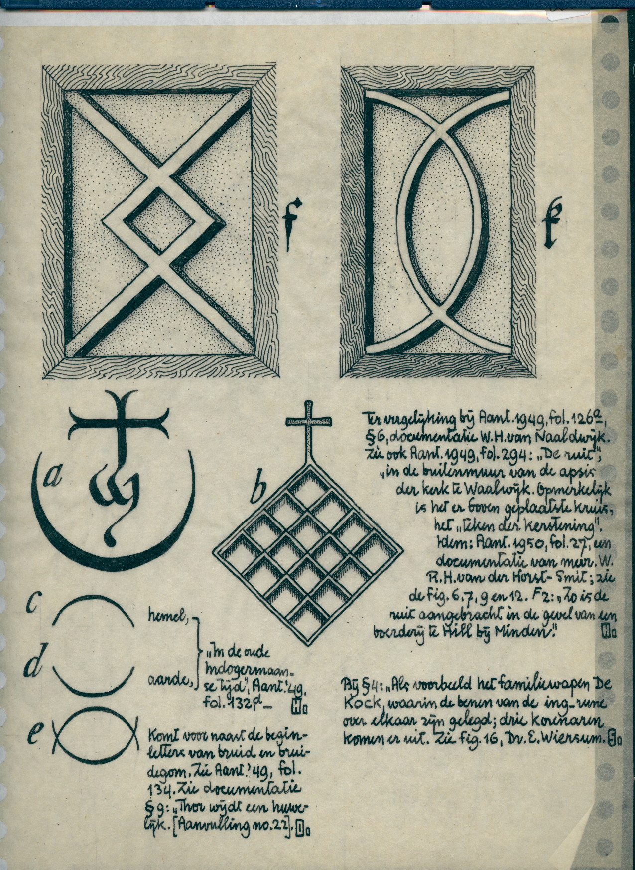‘For comparison with notes 1949, fol. 126a, § 6, documentation W.H. van Naaldwijk, see also notes 1949, fol. 294: “The diamond in the outer wall of the apse of the Church in Waalwijk. Noticeable is the cross above, the “sign of Christianising”. Idem: notes 1950, fol. 27, documentation of mrs. W. R.H. van der Horst-Smit; see the fig. 6, 7, 9 and 12. F12: “The diamond is to found in the façade of a farm in Hill near Minden.” H.’
