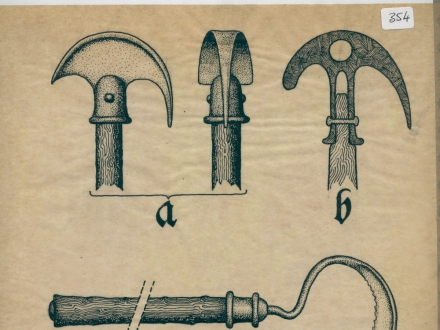 - drawing of 5 frontispieces and a man with stang, sword and wreath; and notes