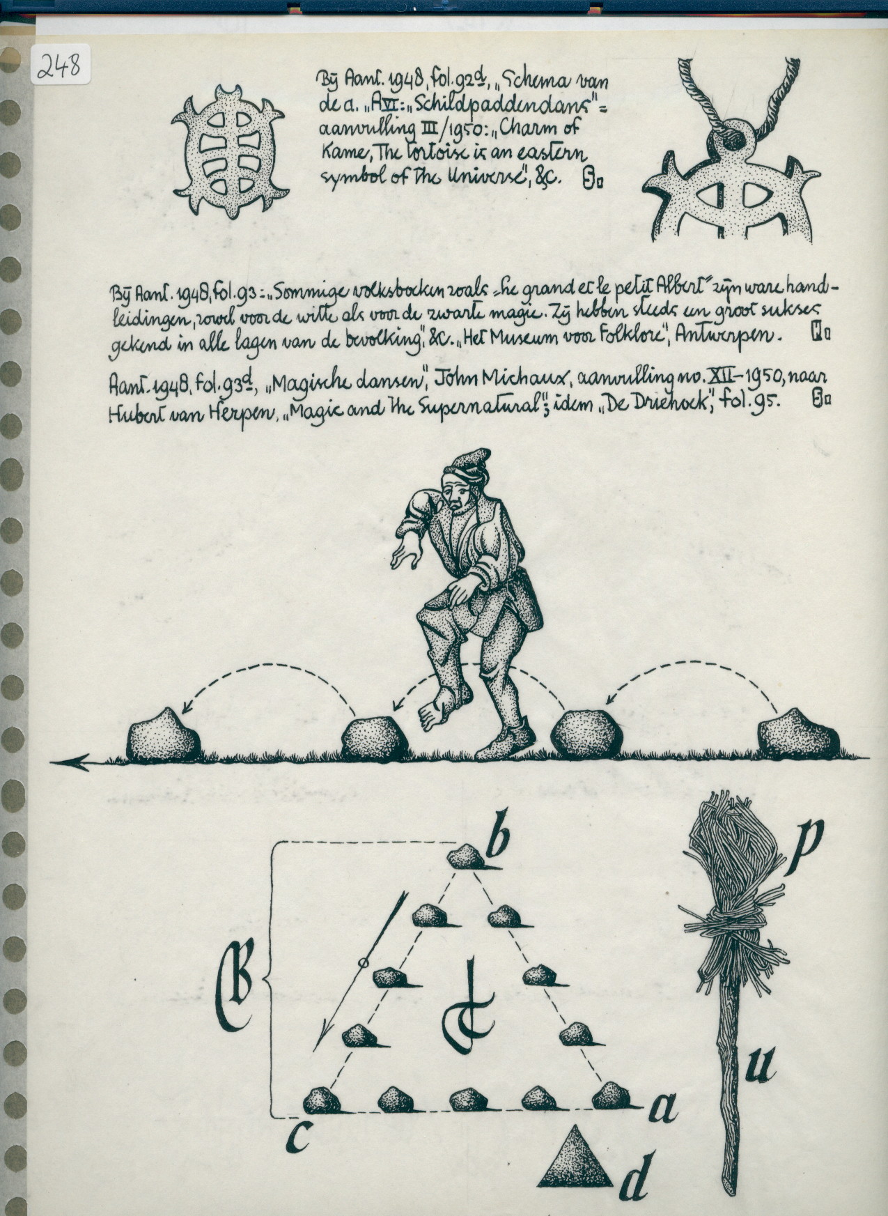 Aant. [notes] 1948, fol. 93d, Magische dansen [magical dances], John Michaux, aanvulling [supplement] no. XII-1950, naar [after] Hubert van Herpen, Magic and the supernatural; idem, De Driehoek [the triangle], fol. 95. S.