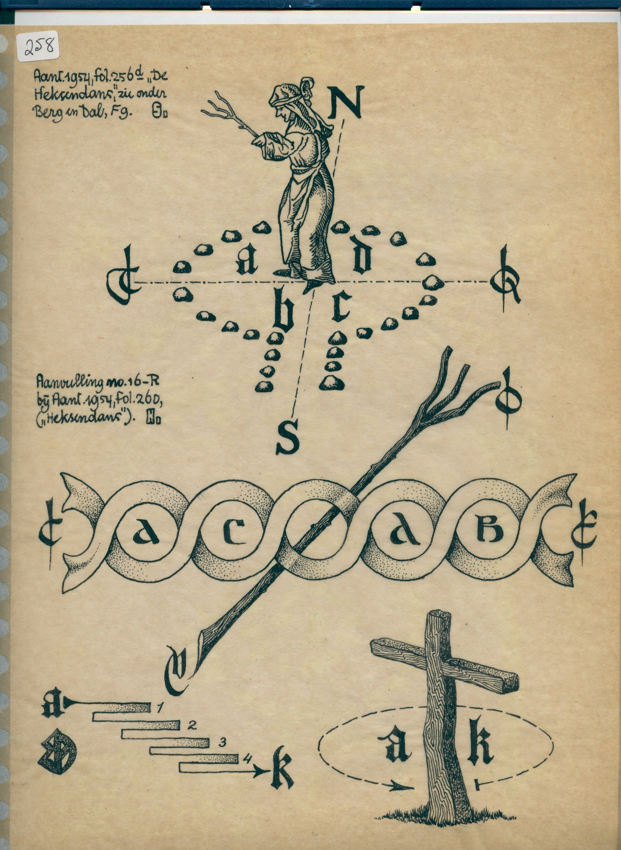 ‘Aant. [notes] 1954, fol. 256d “De Heksendans” [the witches dance], zie under [see under] Berg en Dal, F9. S.’ ‘Aanvulling [supplement] no. 16-R bij Aant. [with notes] 1954, fol. 260, (“Heksendans” [witches dance]). H.’
