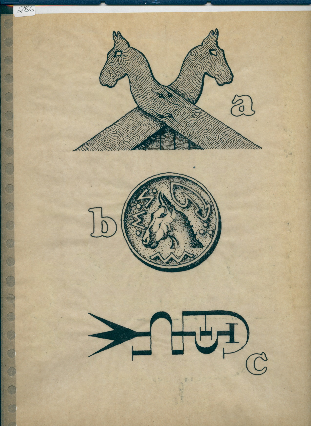R/2/286 – drawing of a frontispiece of 2 horse heads, coin with horse head and a sigil