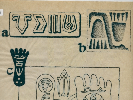 drawing of a frontispiece of 2 horse heads, coin with horse head and a sigil