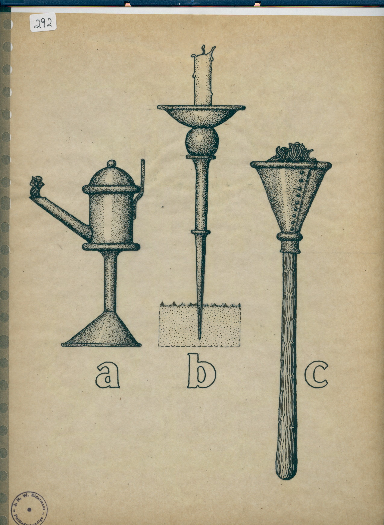 R/2/292 – drawing of a oil-lamp, torch and candleholder on a pike