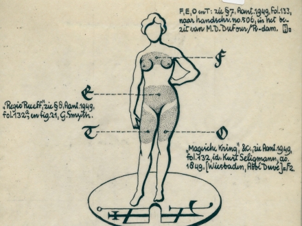 Notes: ‘Bij Aant. [with notes] 1942, fol. 28d, zie [see] “Magier des Mittelalters”, documentatie Herman Roolvink, handschr. [manuscript], ao. 1904, § 3. “Sexueel-erotische riten” [sexual-erotical rites], &c, zie onder [see under] “cunnilingus”, § 4, fol. 28e. E.’