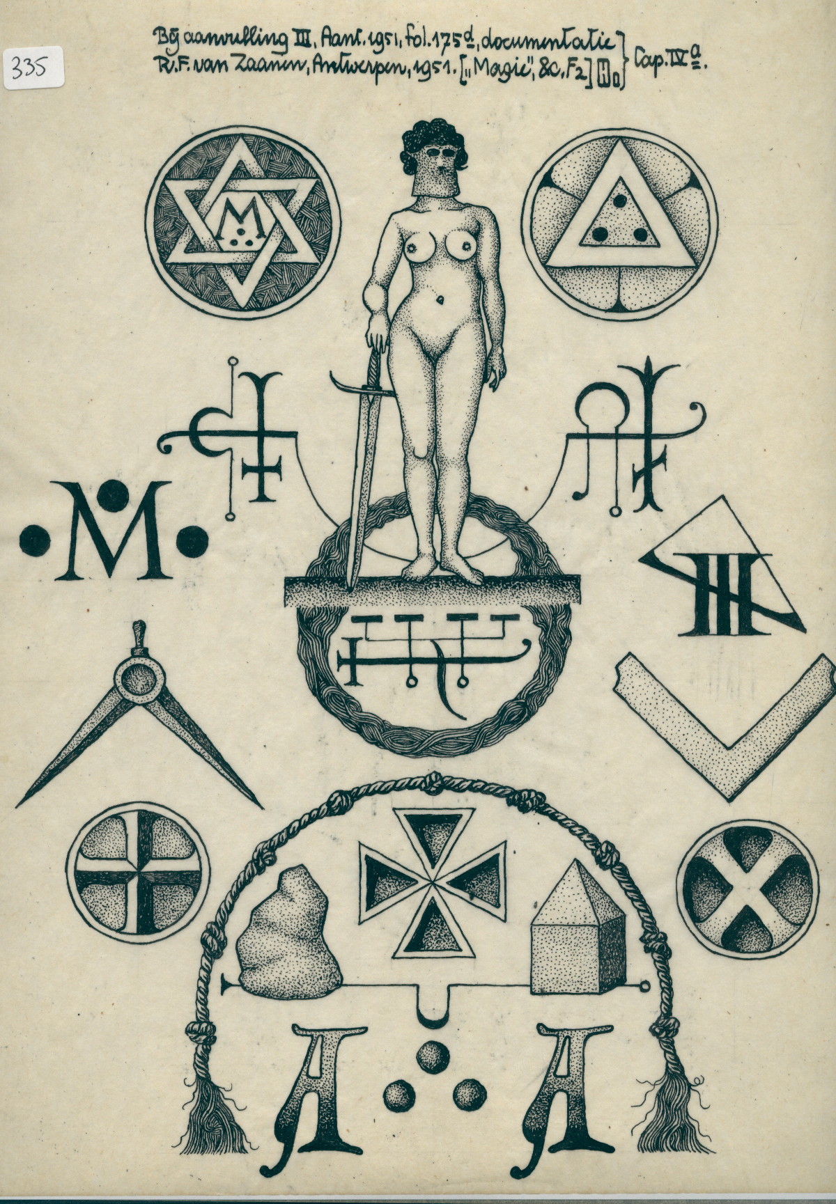 Hexagram in circle with M and 3 dots. Triangle with s dots in circle. Veiled woman with sword, laurel, sigils, M and 3 dots. Compass. Two Greek crosses. Maltese cross. Stone. Pyramidical shape. AA and 3 dots. A knotted rope. Bij aanvulling [with suppl] III, Aant. [notes] 1951, fol. 175d, documentatie R.F. van Zaanen, Antwerpen, 1951. (magic, &c, F2). H. } Cap. IV a.