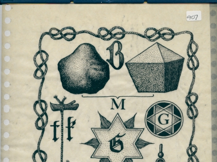 Hexagram in circle with M and 3 dots. Triangle with s dots in circle. Veiled woman with sword, laurel, sigils, M and 3 dots. Compass. Two Greek crosses. Maltese cross. Stone. Pyramidical shape. AA and 3 dots. A knotted rope. Bij aanvulling [with suppl] III, Aant. [notes] 1951, fol. 175d, documentatie R.F. van Zaanen, Antwerpen, 1951. (magic, &c, F2). H. } Cap. IV a.