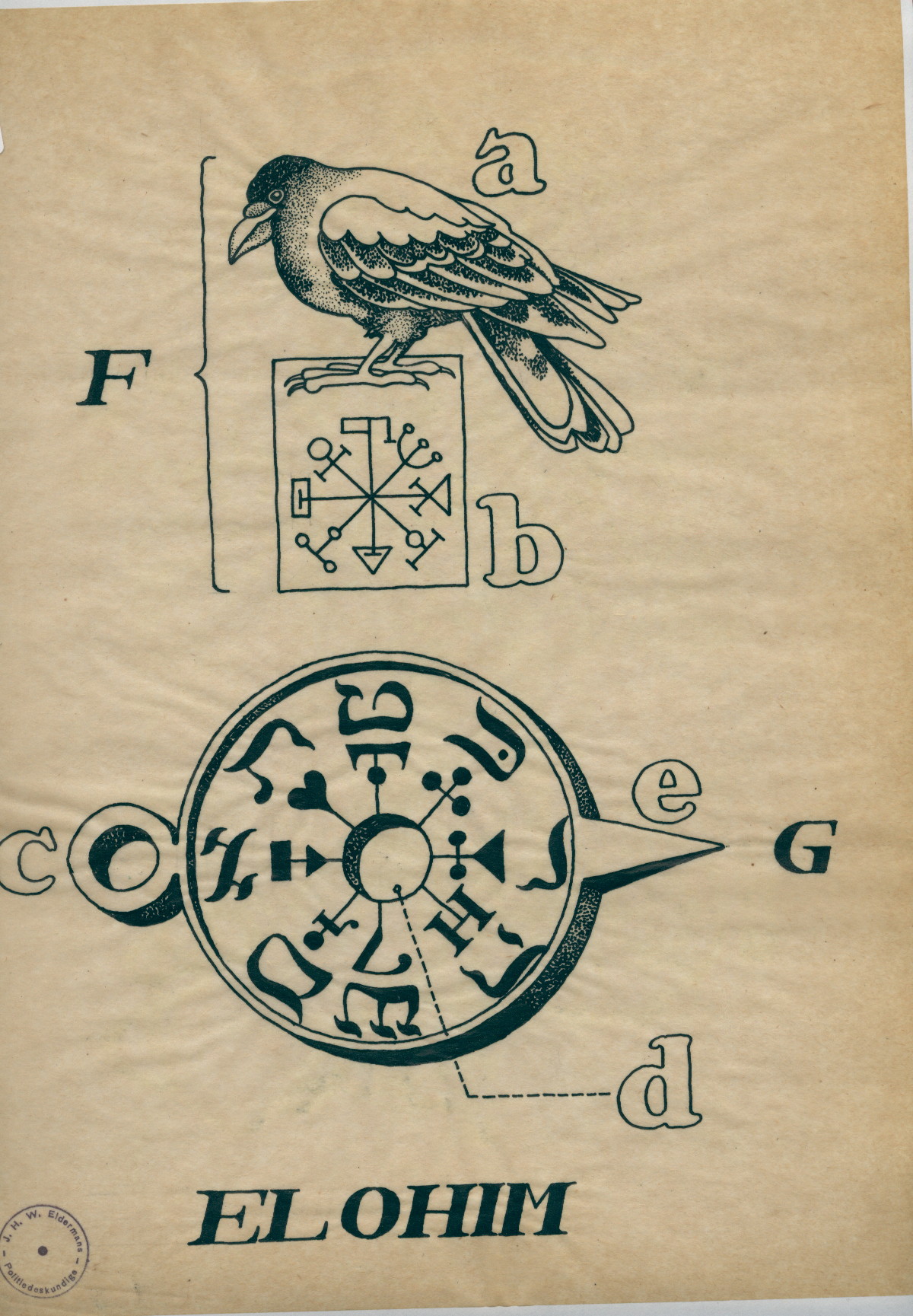 The crow ‘a’ stands on square with symbols ‘b’, together they form ‘F’. A disc with symbols ‘G’ on ring ‘c’, with a spike ‘e’ and a hole in the middle ‘d’. ‘Elohim’.