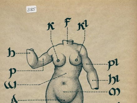 R/2/383 – Drawing of a female figure with circle, letters and sigils