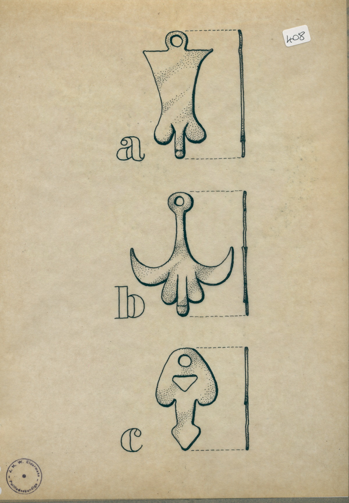 Phallic amulet ‘a’. Phallic amulet ‘b’, with two horns or crescents. Phallic amulet ‘c’ with inverted triangle cut out. All front and side view.