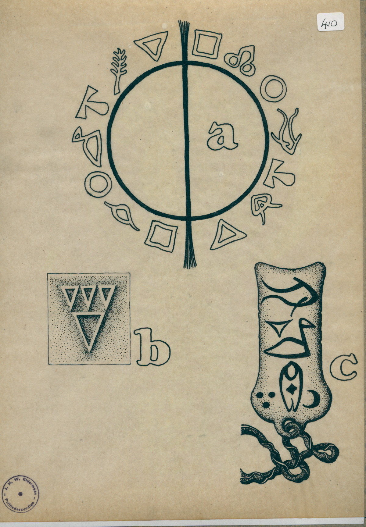 R/2/410 – drawing of a circle with symbols around, triangles, amulet with symbols