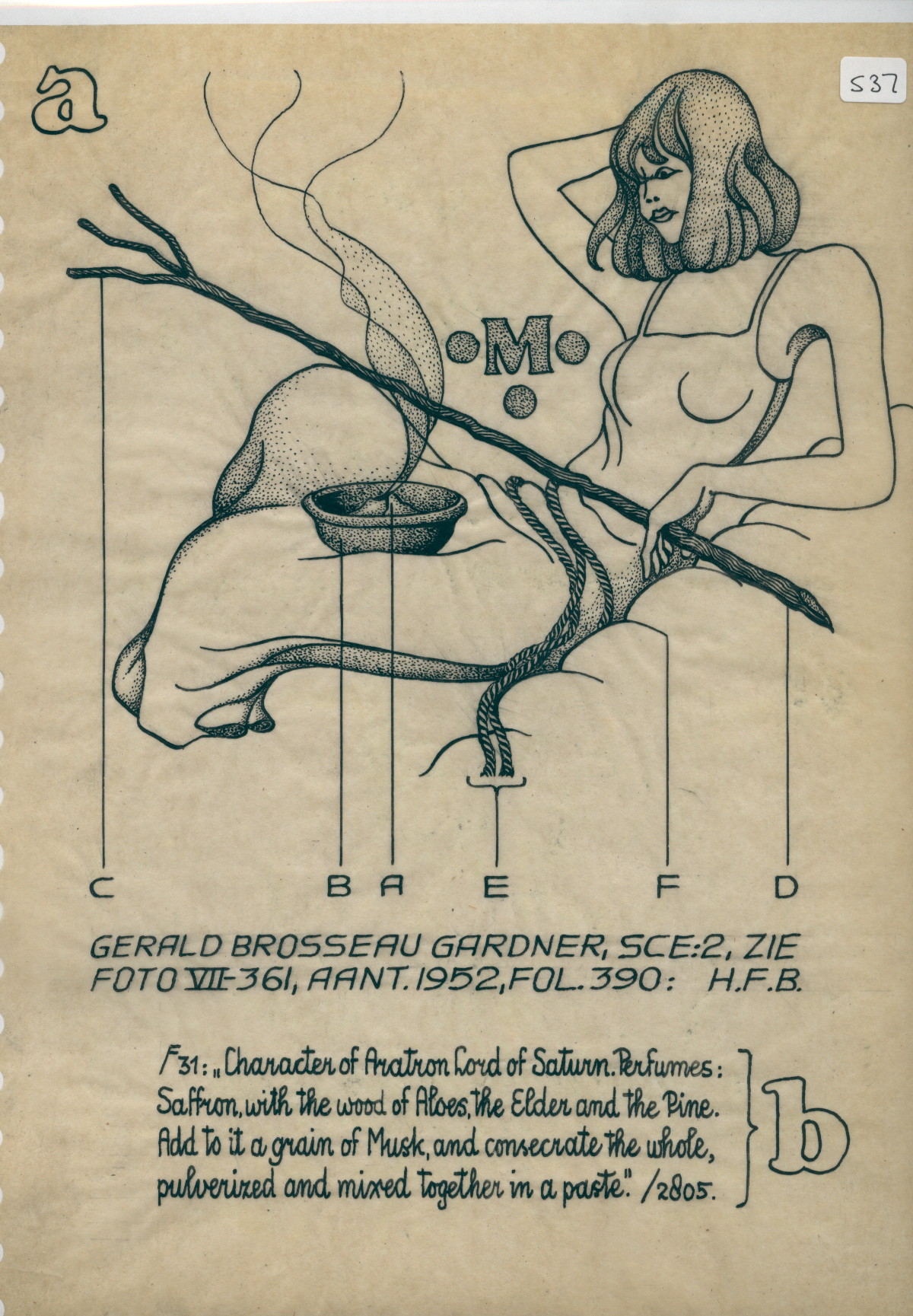 The woman is clothed and sits in a resting position a. In her lap lies a bowl B with incense A. Around her middle a cord C. Whatever she sits on F. She holds a 3-tipped C branch D. An M with 3 dots.