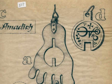 Foot-amulet ‘a’ with a sigil on it. Foot-amulet ‘b’ with 2 hearts cut out, and signs of taurus and Gemini. Foot ‘c’ with a dot, a large S, and letters A M W K.