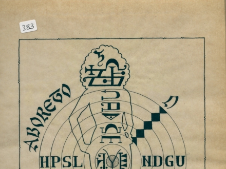 R/3/595 – Drawing of a woman standing on a complex figure, holding a wand with crescent