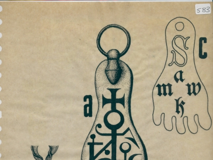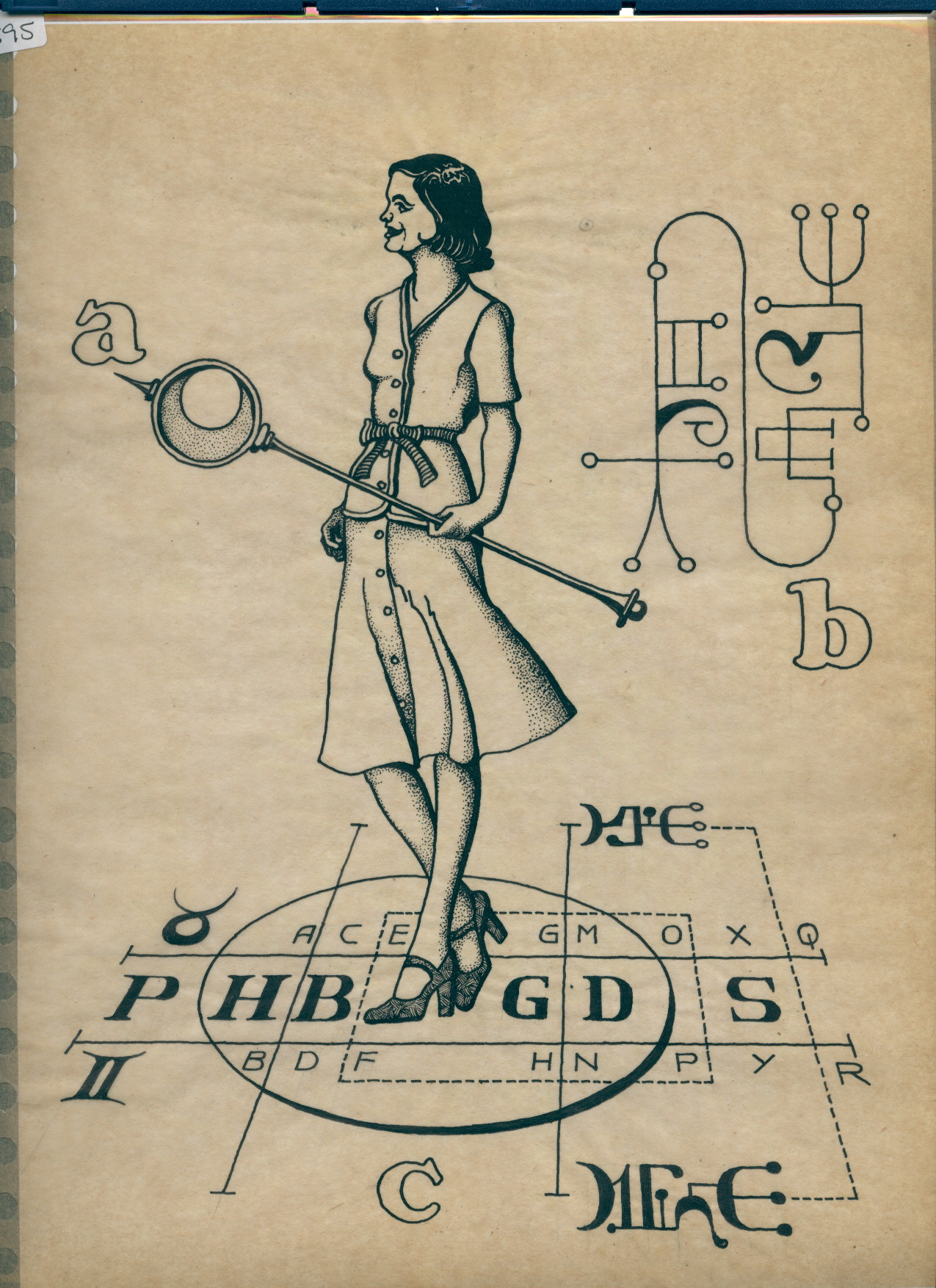 The woman stands on figure ‘c’, which is made up of squares and a circle, and is divided in three parts; taurus, P and Gemini. In the circle amongst other letters HB and GD and S. Sigil ‘b’. She holds a wand with crescent top ‘a’.