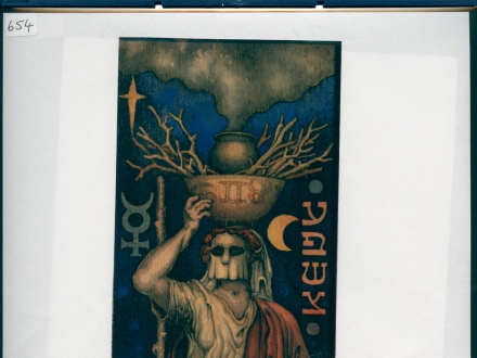 - Drawing of a woman standing on a complex figure, holding a wand with crescent