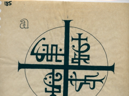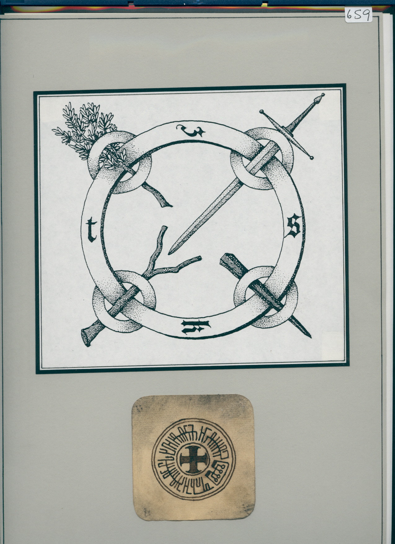 A large ring. Four smaller rings held in place by a sword, a large spike, a divination rod and a branch. On the ring the letters S, K, T and ? Below it a brown Greek cross in a circle filled with a sigil and letters ?
