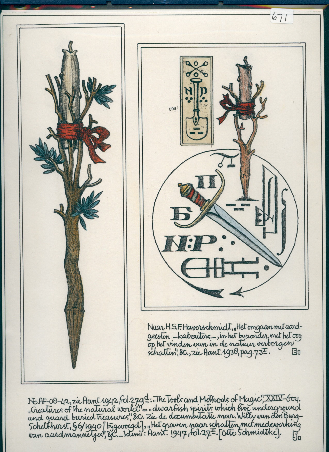 No. AF-08-42, zie Aant. [see notes] 1942, fol. 279d: The Tools and Methods of Magic, XXIV-604. Creatures of the natural world = dwarfish spirits which live underground and guard buried treasures, &c. Zie de documentatie mevr. [see the documentation mrs.] Willy avn der Burg-Schelfhorst, § 6/1940 (bijgevoegd) [enclosed], Het graven naar schatten, met emdewerking van aardmannetjes, [the digging for treasure, with cooperation of little eartmen], &c. Idem: Aant. [notes] 1947, fol. 27 II. (Otto Schmidtke). S.