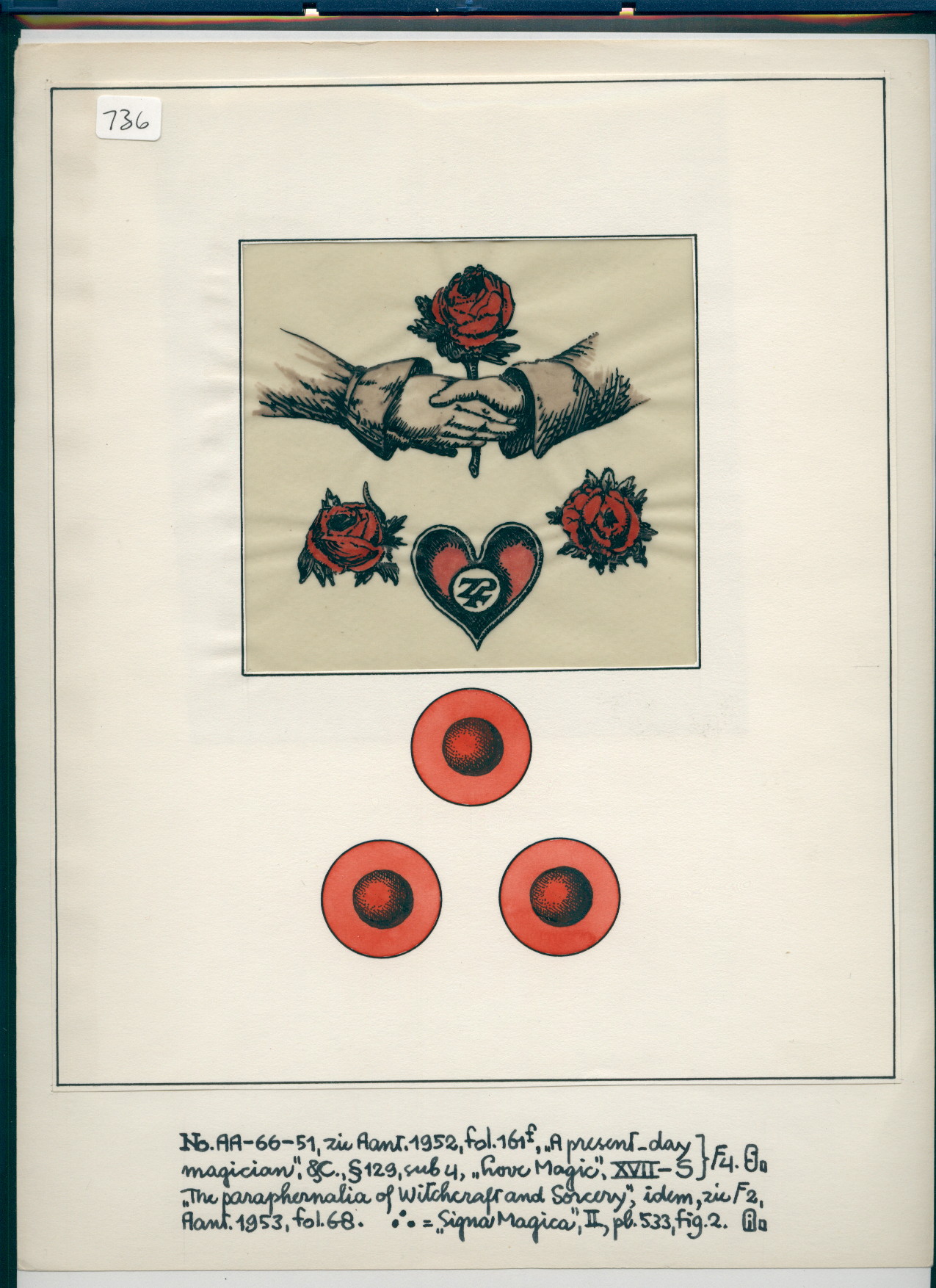 Two hands shaking each other, with a red rose in between and two more below. A heart with possibly planetary sign in the middle below. Three red dots in red circles. No. AA-66-51, zie Aant. [see notes] 1952, fol. 161f, A present-day magician, &c, § 129, sub 4, Love Magic, XVII-S } F4. S.