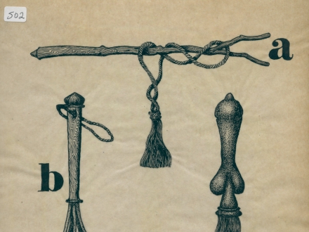 - drawing of an amulet, an object, a phallic whip and a bunch of twigs