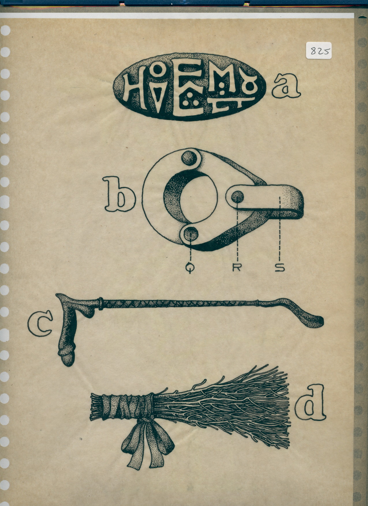 R/6/825 – drawing of an amulet, an object, a phallic whip and a bunch of twigs