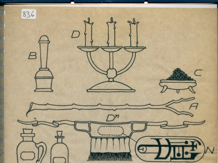 R/6/834 – drawing of different tools, such as daggers, a scourge, a divination rod, candles and others
