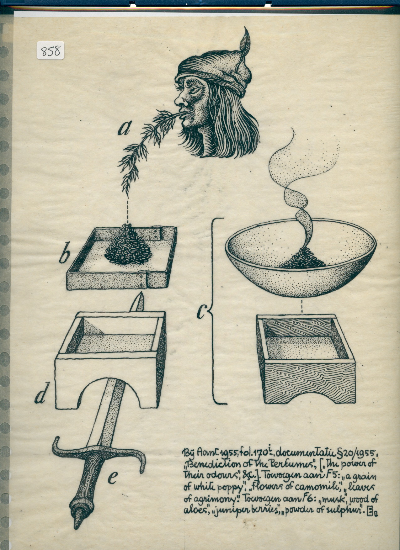 A man holding a twig in his mouth ‘a’. A tray with incense ‘b’. A bowl with incense on a square stand ‘c’. A stand ‘d’ with sword ‘e’ below it. Bij Aant. [with notes] 1955, fol. 170i, documentatie § 20/1955, Benediction of the Perfumes, (the power of their odours, &c.) Toevoegen aan [add to] F5: a grain of white poppy, flowers of camomile, leaves of agrimony. Toevoegen aan [add to] F6: musk, wood of aloes, juniper berries, powder of sulphur. E.