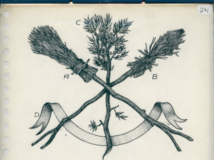 A hand holds a branch over circle m, on line ? – E. A hand holds a wand with hair (?) on line ? – O. ‘The magic of everyday life’. ‘The tools and methods of magic’. ‘Bij documentatie [with doc.] § 24, Aant. [notes] 1940, fol. 44b. Toevoegen aan [add to] F2: Wilhelm Mannhardt, “Der Baumkultus der Germanen” [the tree-cult of the Germanics], berlin, 1904. Zie [see]: “The Magic of Everyday Life”, III, p. 171. E.’