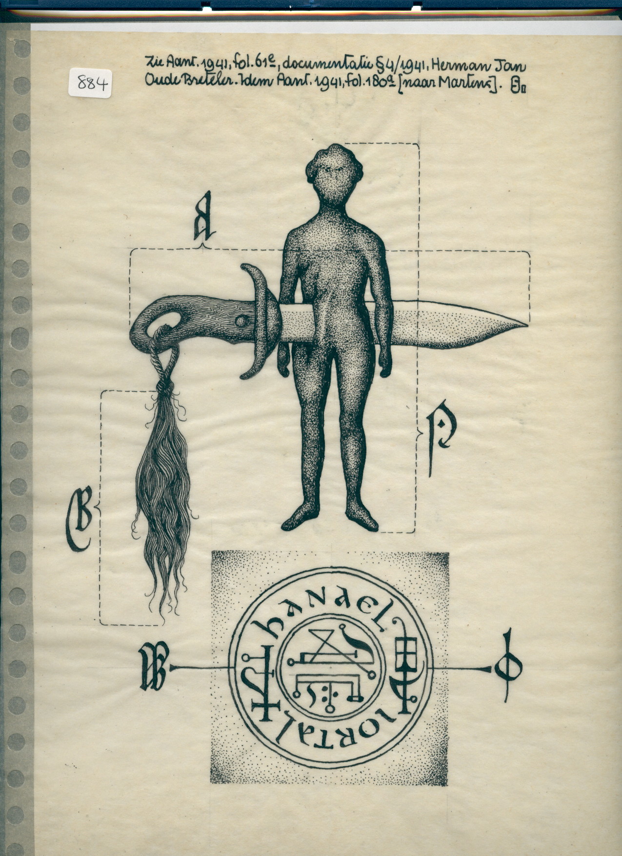 A human figurine with a knife through. Letters A, B and P around. A circle with names ‘hanael’ and ‘lortal’ and sigils; letters ? And Q. Zie Aant. [see notes] 1941, fol. 61e, documentatie § 4/1941, Herman Jan Oude Breteler. Idem Aant. [notes] 1941, fol. 180a (naar [after] Martens). S.