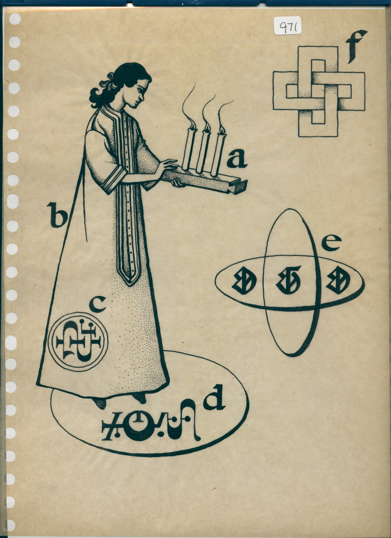 Sigils ‘f’ and ‘e’ might be alluding to cunnilingus/ Woman ‘b’ holds candleholder ‘a’, on her dree sigil c and in the circle sigil ‘d’.