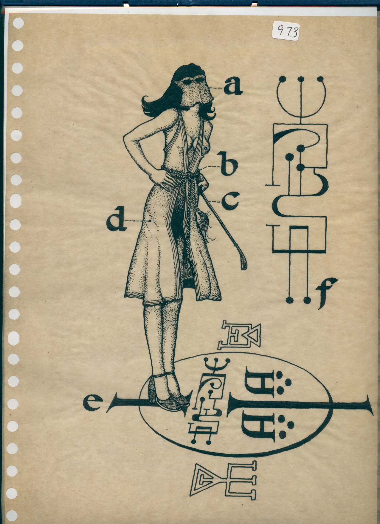 R/6/973 – drawing of a veiled woman with a whip, a circle, a sigil