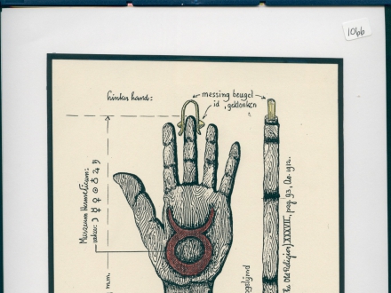 Height 281 mm. Sign of Libra on the palm. Tip of middle finger red. Eigendom [property of]: Dr. M.A. van Moorland, tentoonstelling [exhibition] Delft, 1950. Herkomst onbekend [origins unknown]. Eikenhout [oakwood], grootste dikte [largest thickness] 14 mm.
