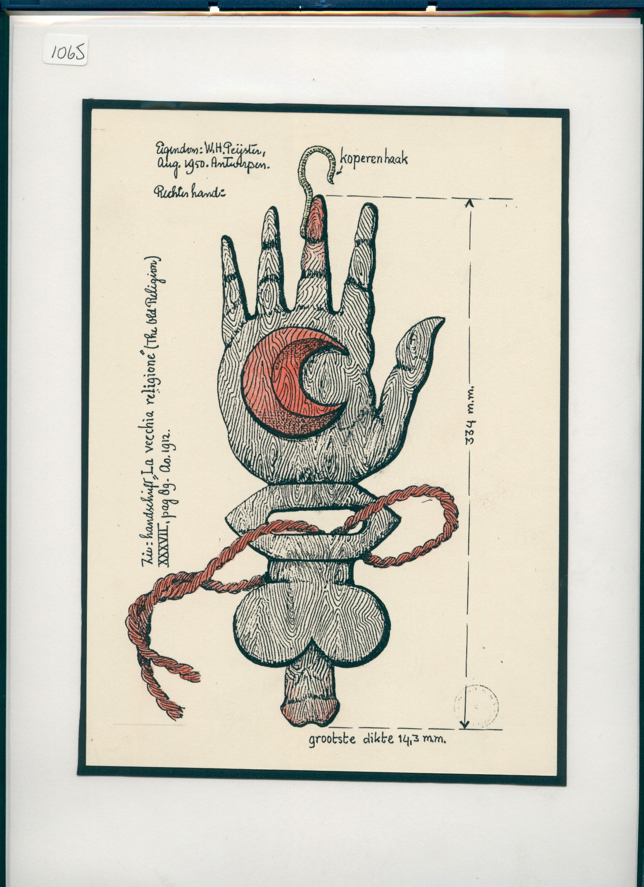 On the red tip of the middle finger a ‘koperen haak’ [copper hook]. A red crescent on the palm, a red cord through the wrist, and a phallus. Height 334mm, ‘grootste dikte’ largest thickness’ 14,3 mm. ‘’Eigendom [property of]: W.H. Peijsten, aug. 1950, Antwerpen.’