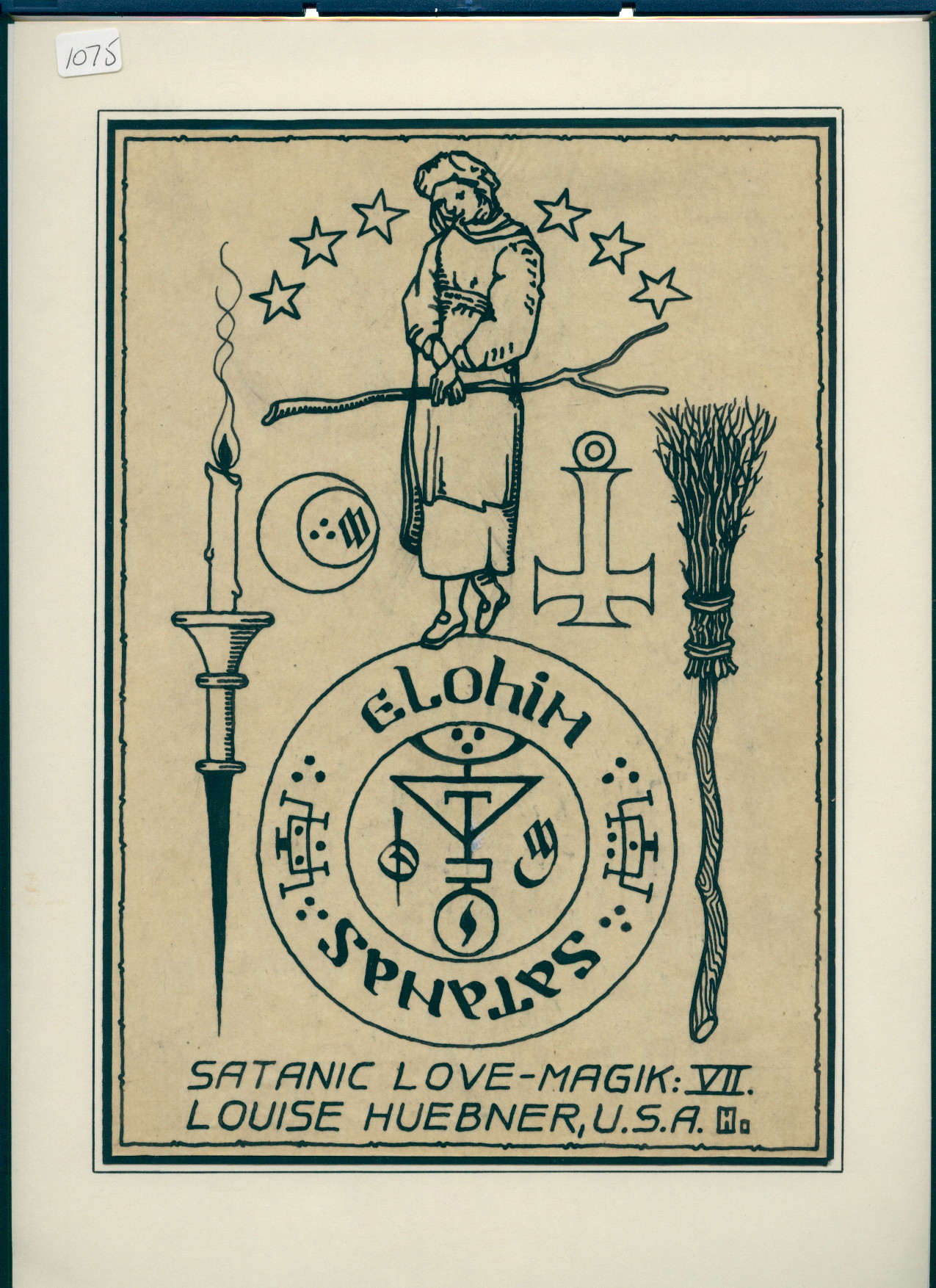 On a circle with ‘elohim’ and ‘satarnas’ stands a woman holding a divination rod. Around her stars, a crescent with 3 dots and inv. cross. To either side of the circle a broomstick and candle in holder. In the circle also sigils and 3 dots.