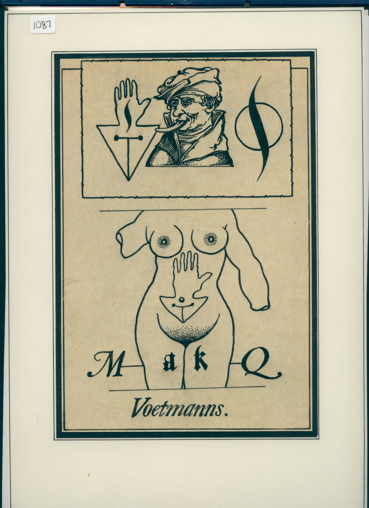 A man’s head and yoni symbol with a hand. A female torso, letters M-Q and a k, yoni symbol with hand.