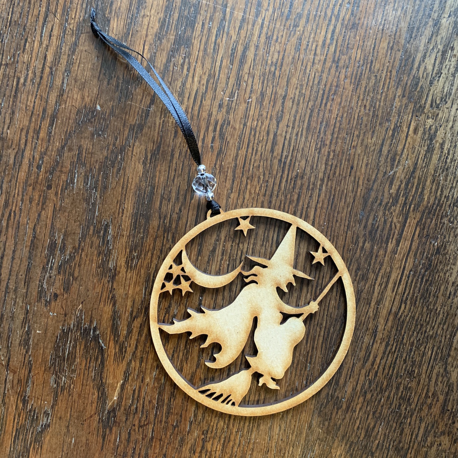 This decorative charm consists of a fretwork-effect circle containing a representation of the witch that is painted outside the museum, suspended from a thin black ribbon.