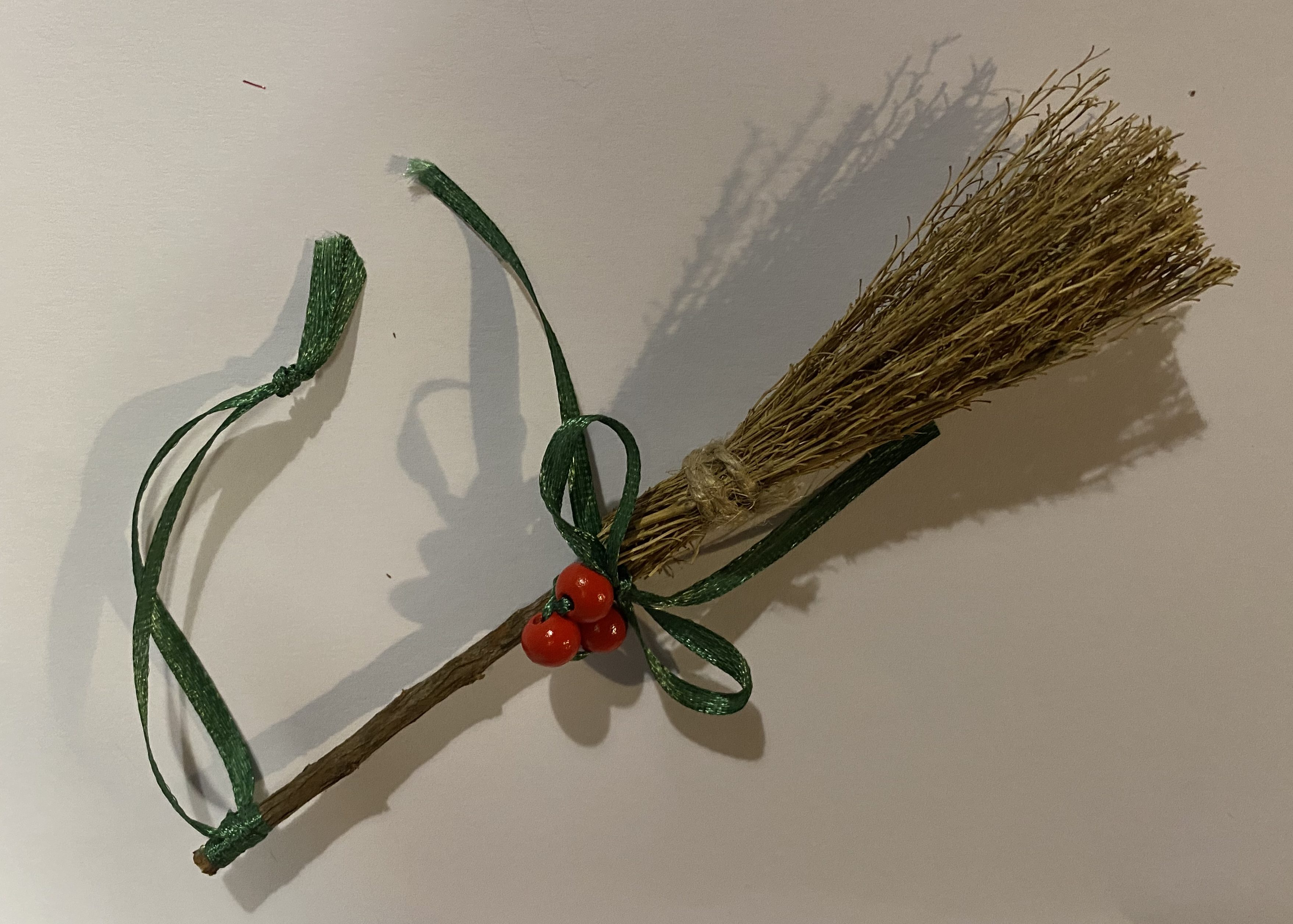 This tiny real twig broom is just 15cm (6″) long, bound with string, and decorated with festive beads and ribbon.